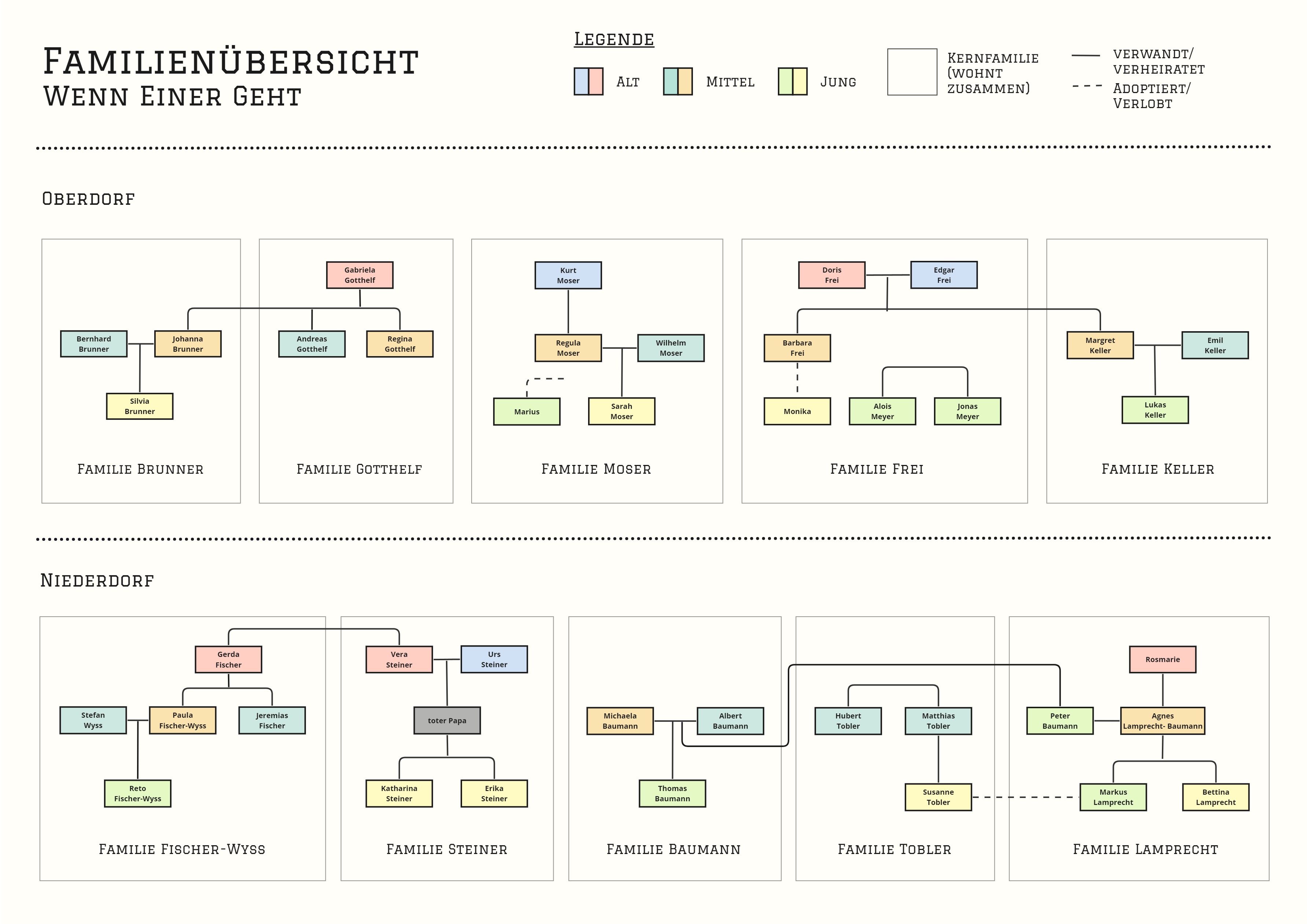 Wir bespielen drei Generationen Alt, Mittel und Jung. Natürlich gibt es auch noch jüngere oder ältere Menschen, diese kommen jedoch nur im Hintergrund oder in speziellen Fällen vor. Die drei Generationen haben bewusst keine spezifischen Altersangaben. Das genaue Alter der Charaktere ist für das Spiel irrelevant. Viel wichtiger ist, dass die Menschen derselben Generation zusammen aufgewachsen sind und eine gemeinsame Jugend gehabt haben. Sie haben also zumindest gewisse Bezugspunkte, die wir am Workshop am Donnerstag noch ausarbeiten werden. Zudem hat die Gesellschaft andere Erwartungen an Leute aus unterschiedlichen Generationen.